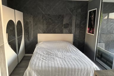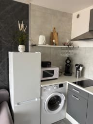 L’appartement comprend un lit queen-size (160 cm) et un canapé convertible, pouvant accueillir jusqu’à 4 personnes. La cuisine est moderne et entièrement équipée pour votre confort.