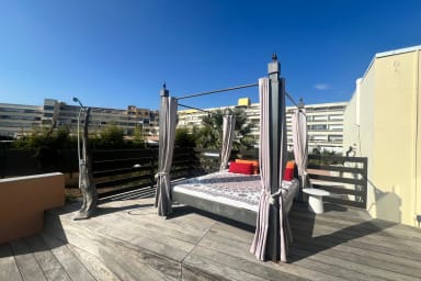 - Grande terrasse avec lit extérieur pour profiter des journées ensoleillées et d’événements privés